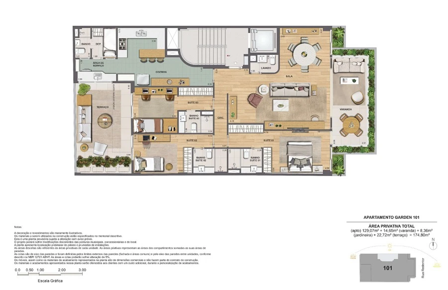 Apartamento Garden com 3 Suítes, com 174m².